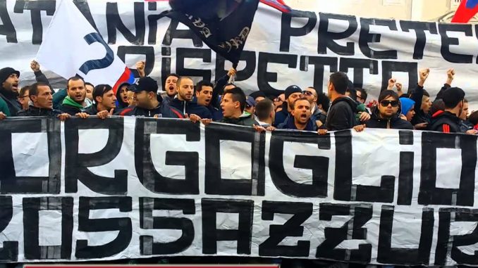 Questo mio articolo comincia così, su vecchie note rock dedicate ai colpi di testa di Claudio Ciceri e ai voli acrobatici di Zeliko Petrovic sullo spelacchiato prato del vecchio “Cibali”. Ascoltavo in silenzio, battevo le mani, abbracciavo tutti e mi sentivo felice avvolto dentro la bandiera.