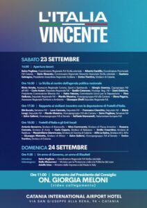 A Catania la due giorni, che si aprirà sabato 23 alle ore 16:00, si terrà presso l’International Airport hotel di Via San Giuseppe la rena 94 e vedrà la partecipazione dei Ministri Nello Musumeci e Adolfo Urso, della deputazione nazionale e regionale di FdI, degli amministratori locali di Fratelli d’Italia, e avrà il suo clou domenica 24 mattina con il video intervento del Presidente del Consiglio Giorgia Meloni.